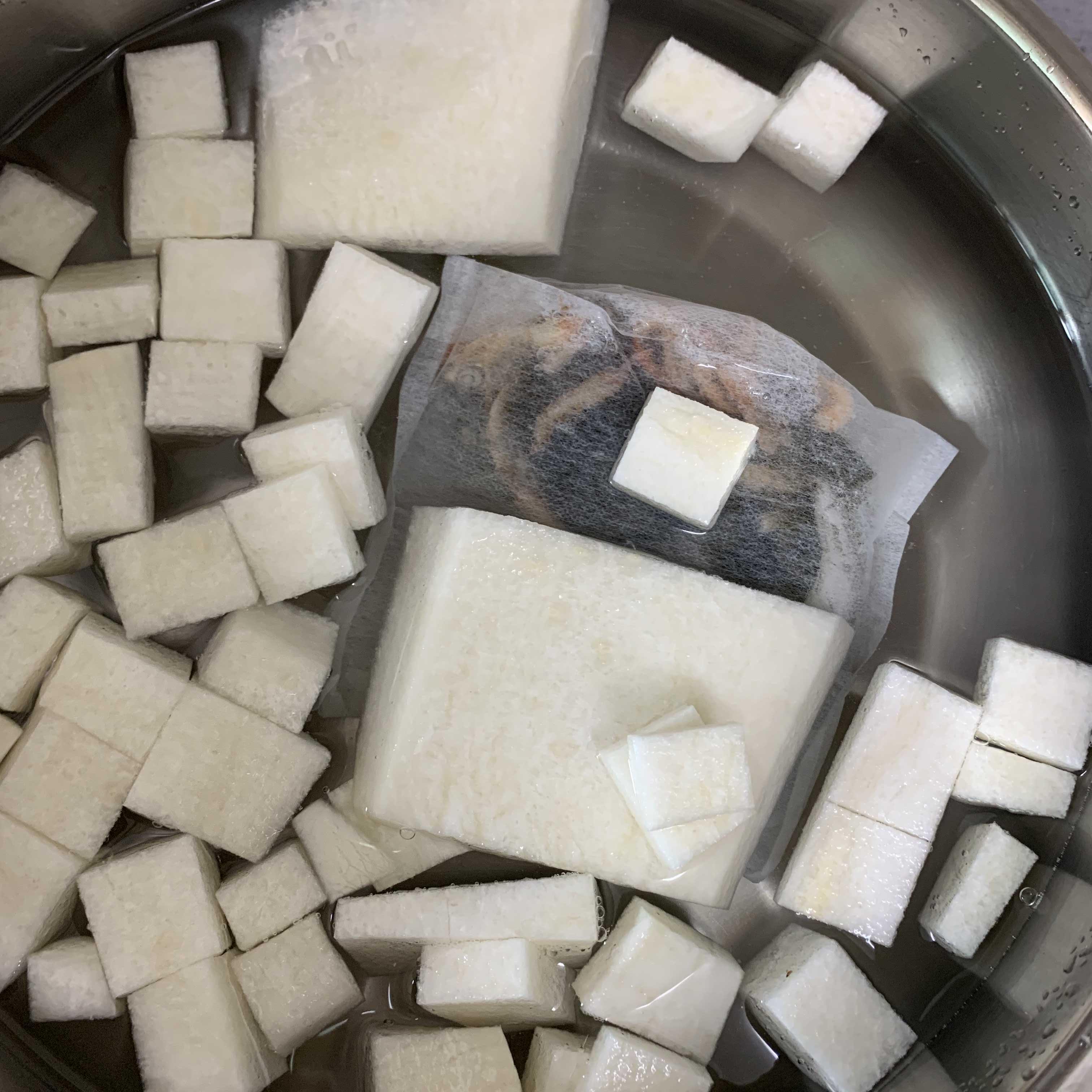 무, 육수 팩을 같이 넣고 끓여 줍니다